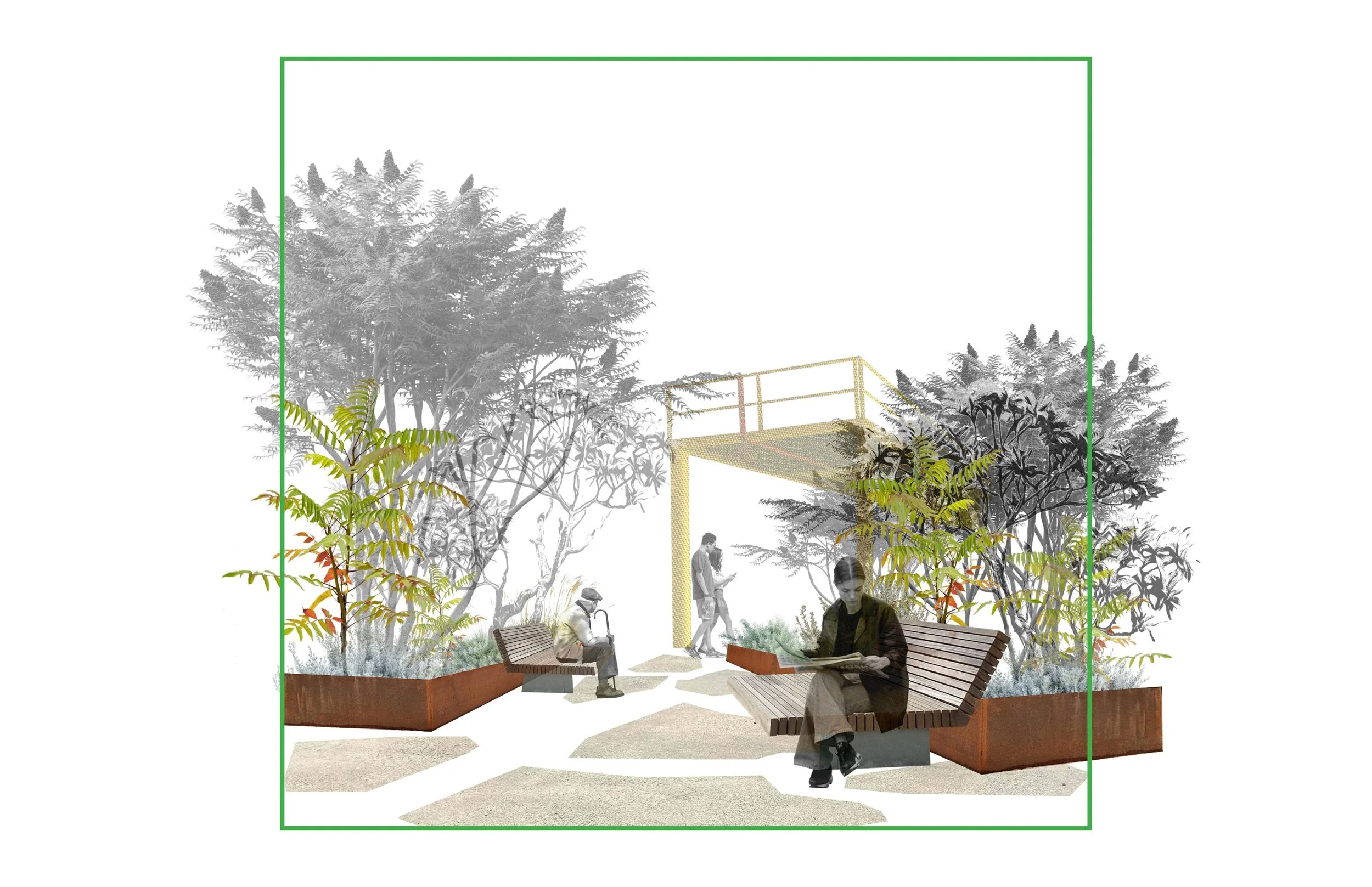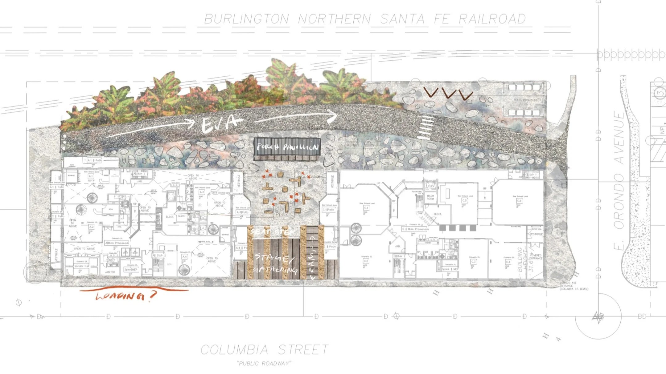 The adaptive reuse of one of the first fruit cold storage warehouses on Columbia St. sustainably honors agricultural heritage while creating a contemporary setting for gathering, making, and community life. The site is envisioned as a lively, open, and adaptable landscape that transforms from a calm, shaded setting for morning meetings and conversation to a vibrant evening social hub animated by dining, markets, and events. Layered plantings reflect the texture and resilience of the valley’s surrounding shrub-steppe landscape while flexible furnishings and infrastructure support a wide range of uses, from small gatherings to large community celebrations. Together, these elements create a place that honors Wenatchee’s past while embracing its future as a dynamic public space for everyday life.
