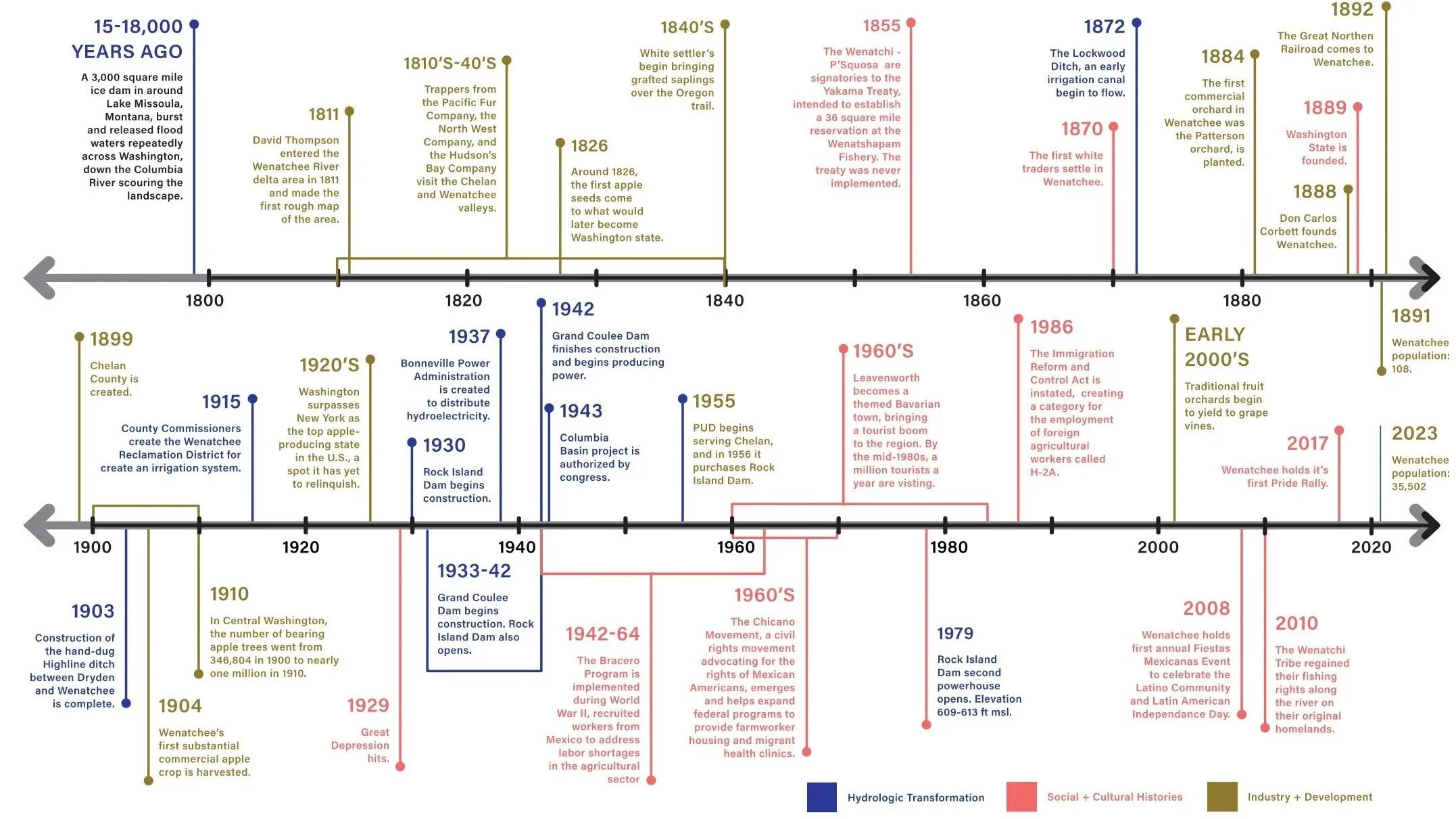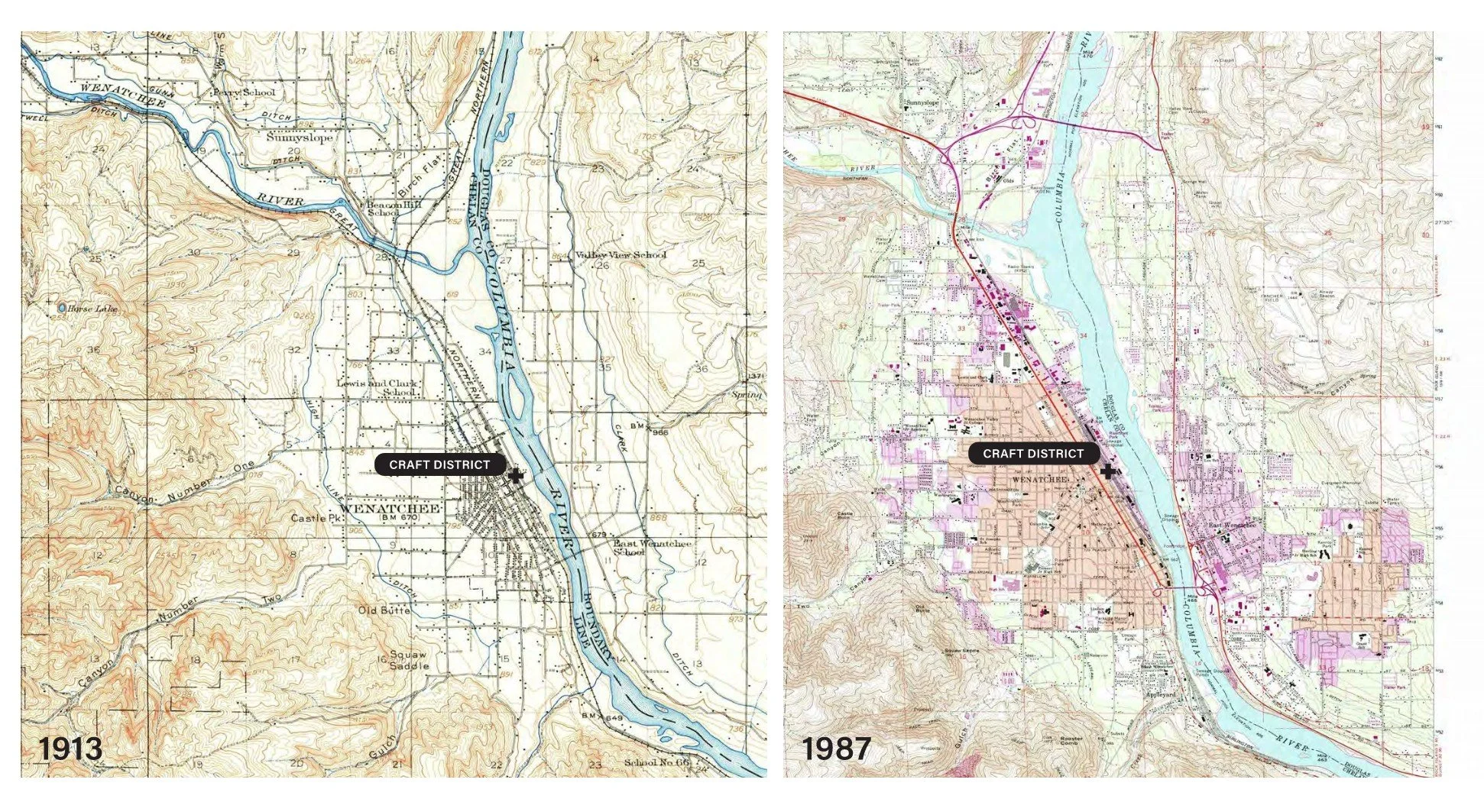 Bordered by the Columbia River and the Cascade Mountains, Wenatchee sits within one of the most climatically diverse regions in the country. Volcanic soils, long hot days, and early industrial ingenuity supported ideal conditions for a booming fruit industry that shaped the region’s growth and identity as “The Apple Capital of the World”. With the arrival of the Great Northern Railway in the late 1800s, Wenatchee expanded rapidly. Today the city faces new pressures as its population grows and priorities shift toward recreation, tourism, and urban development. Through collaboration with Forte Architects and the Chelan Douglas Regional Port Authority, Craft District transforms a fragmented stretch of Columbia Street, once the center of Wenatchee’s treefruit warehouse and rail economy, into a revitalized pedestrian corridor that responds to the city’s evolving needs.
