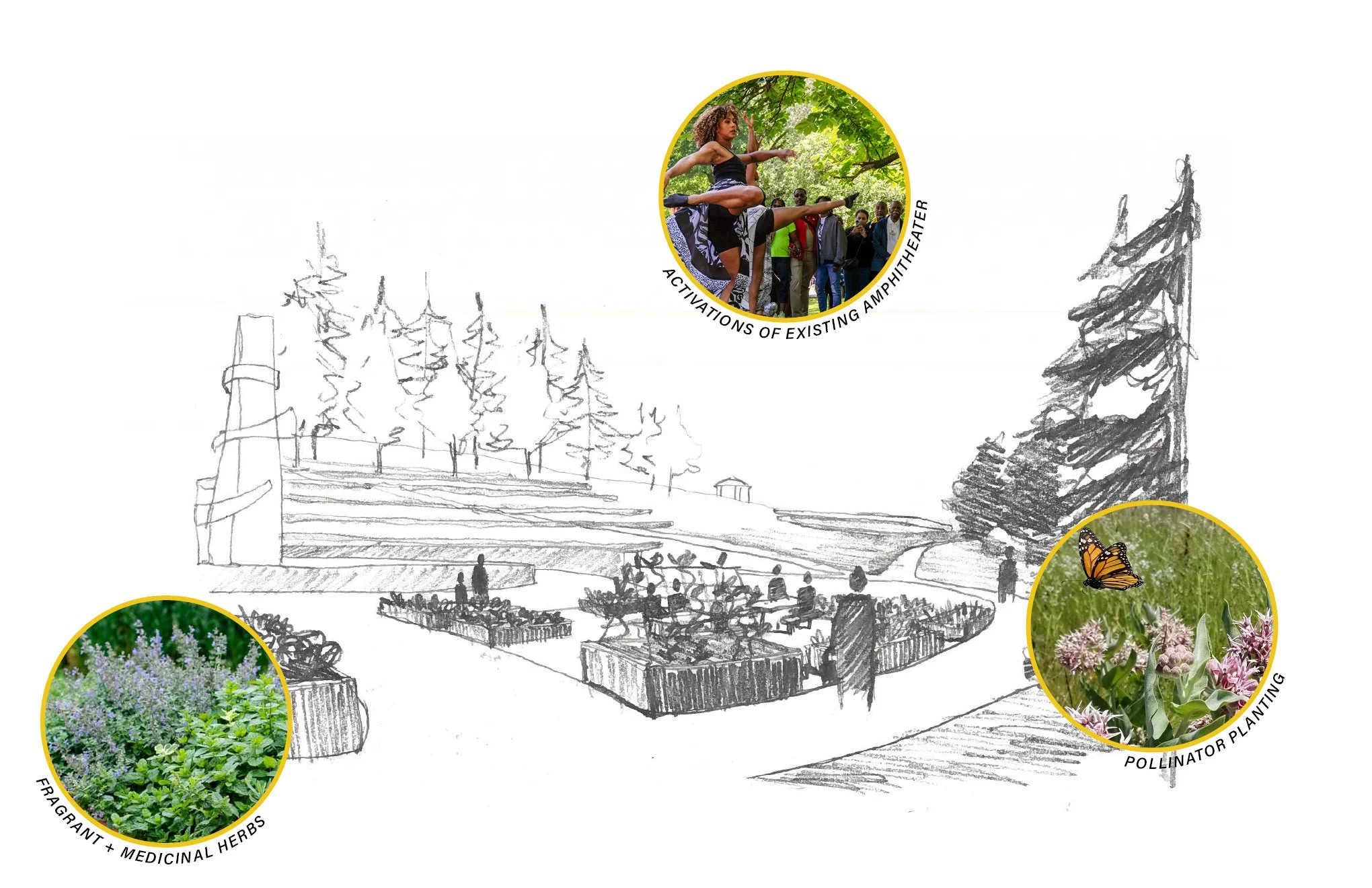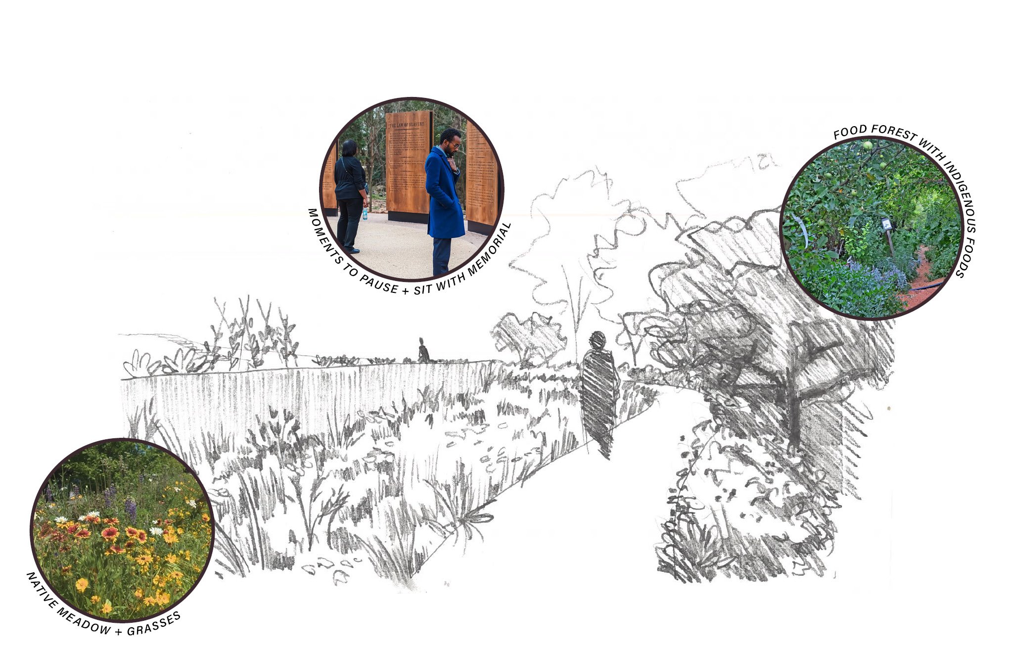 The stakeholders envisioned a serene and supportive sanctuary that harnesses the power of nature, community gathering, and healthy foods to offer solace for those at all stages of grieving. To bring this vision to life on a steeply sloped site, the design centers on a winding memorial walk: a contemplative path that invites personal reflection, with spaces along the way to pause, connect with nature, and visit with lost loved ones. The path is held at both ends by spaces for collective growth, gathering, and joy: an herb and native plant garden next to the existing memorial fountain, and a terraced community garden that offers space for food production, youth programming, and gathering. The memorial walk weaves its way through layers of meadow planting and native food forest, with memorial trellises designed by Colloqate creating moments for pause and reflection.